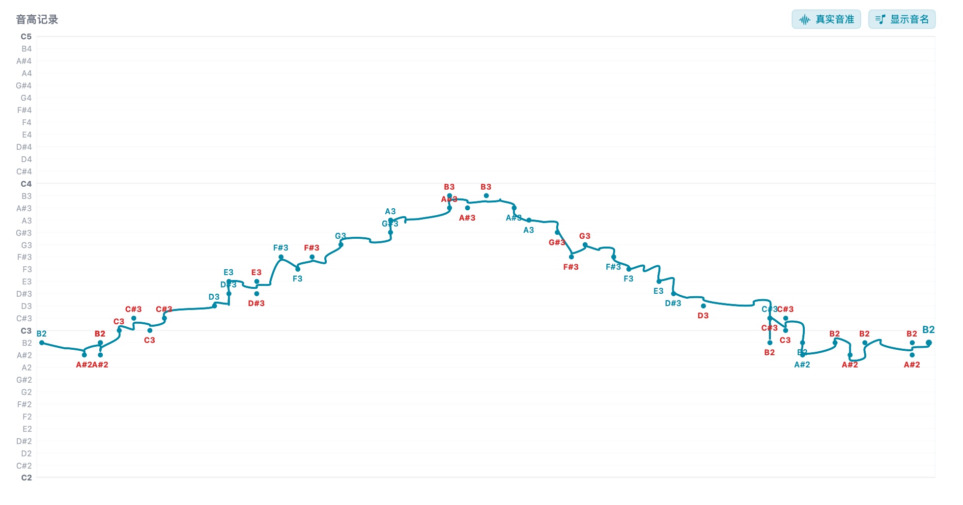Real-time pitch history line chart recording your singing trajectory with snap and real pitch modes.